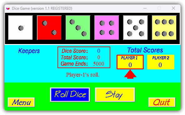 My Dice Game also known as "Greed" or "10,000", is a fast-paced dice-rolling competition that blends luck and strategy. The goal is to outscore your opponent by rolling specific combinations of scoring dice. You can play solo against the computer, or in two-player mode (coming soon) to challenge others online!